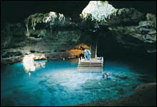 Devil's Den is a most unique dive site. Florida's only underground prehistoric spring. To enter, divers descend down into the earth by a short flight of stairs. Upon reaching the bottom, the echoes of water drops ring through the air cavern. With steam rising from this florida spring, on cool days, gives atmosphere and reason how this dive site got its name. This is a 50 foot depth spring with many swim trough's, air pockets, and prehistoric fossils to excite even the most adventurous of divers. Don't forget the fish food because the catfish are huge and hungry. Like our other guided florida springs dives the water is a constant 72 degree and a 3mm wetsuit is needed.