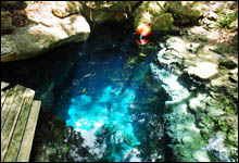 The Manatee Springs dive offers two dive sites at this location. The first is hidden away with little lilly pads called duckweed covering the surface. Once on your descent the bubbles from your regulator open holes in the ceiling for the suns rays to give a beautiful colorful atmosphere. Don't forget the camera, the cavern and the clear springs that makes this 60 foot dive memorable. After swapping out tanks, start the excitement with the spring propulsion ride! This spring has a depth of 40 feet and a high flow spring vent. Fin kicking to the outflow and when you stop the strength of this florida spring glide you with the outflow. The varieties of fish and turtles will excite the diver or snorkeler.